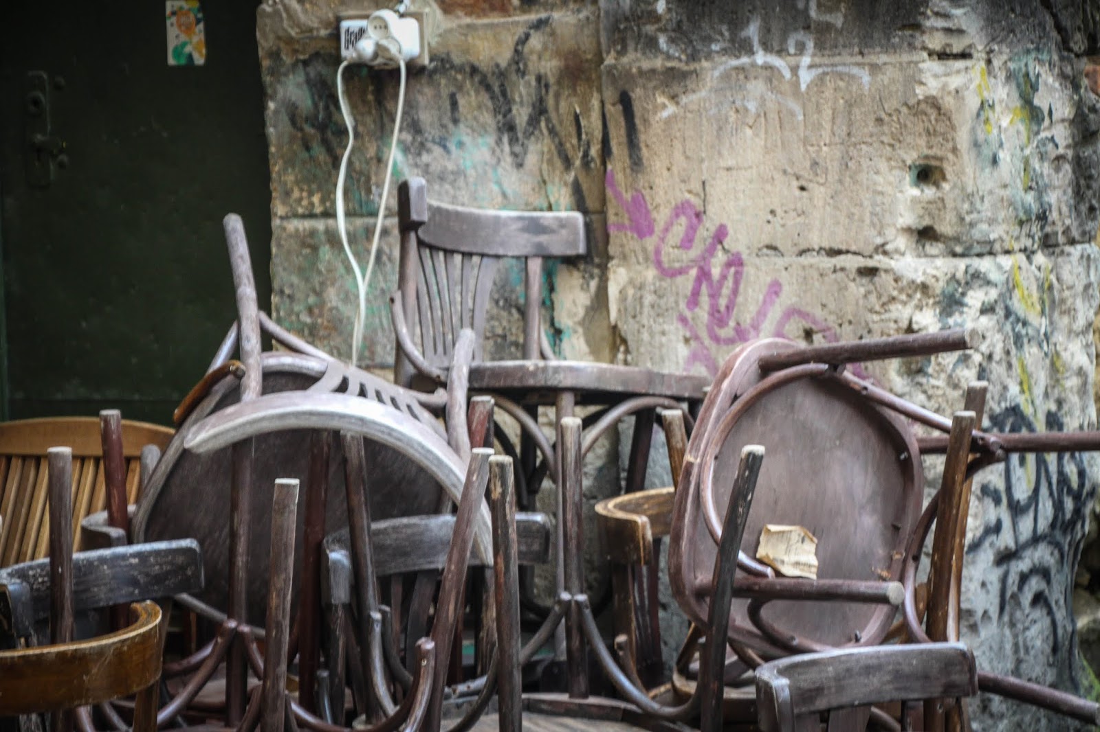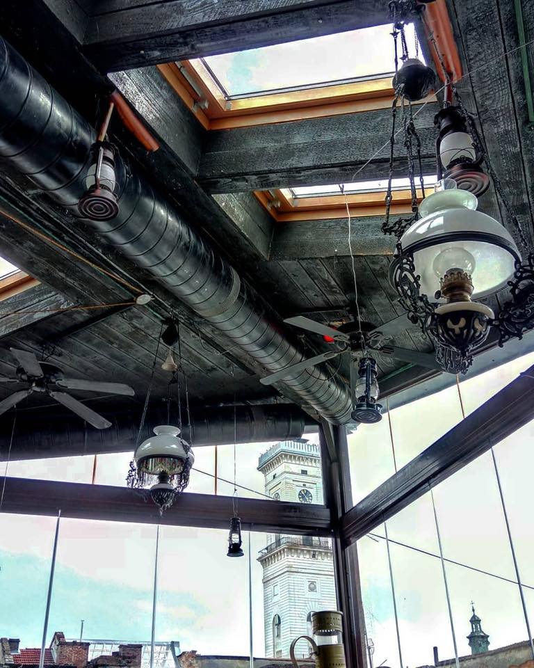 «Гасова Лямпа» занимает три этажа здания, с примыкающей к нему летней террасой, с которой открывается великолепный вид на крыши львовских домов.