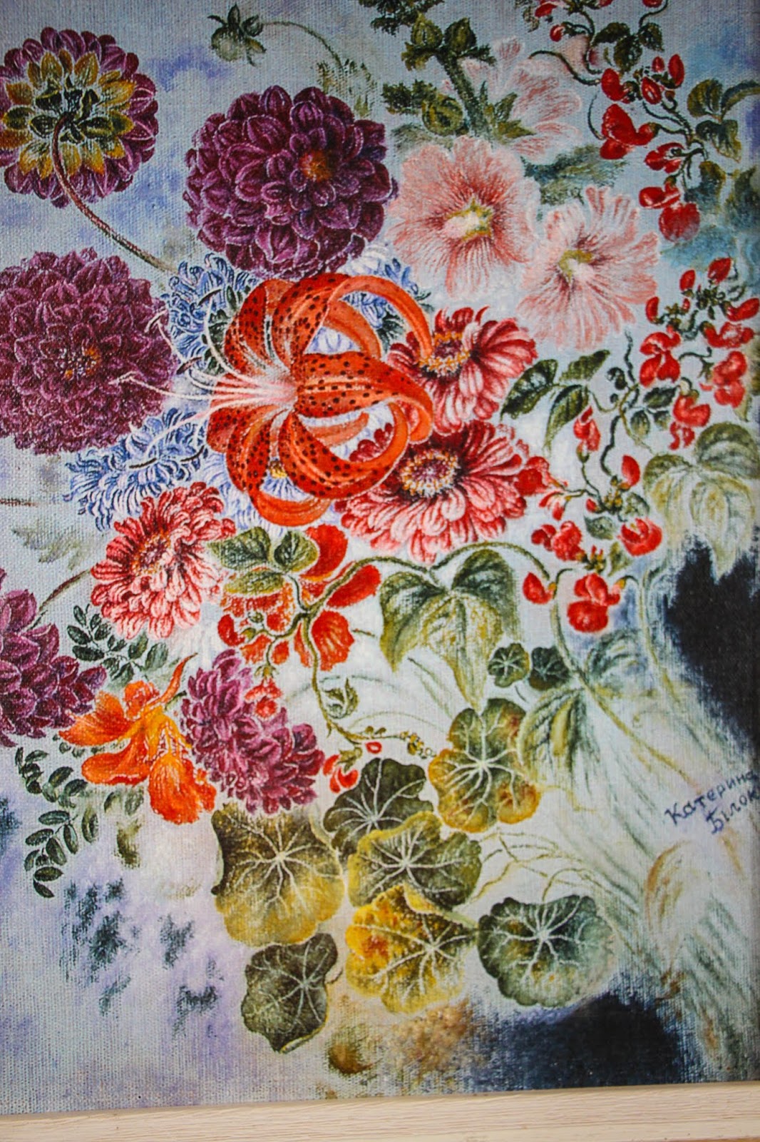 Известность Екатерине Билокур принесли ее цветочные композиции. Художница выписывала каждый цветочек и все ее работы отличаются тщательной детализацией. Над одной картиной мастерица могла работать год. Зимой она писала цветы по памяти, зато весной и летом она работала и в поле, и в саду и даже могла ходить за 30 км., в соседний Пырятинский лес, чтобы нарисовать ландыши.