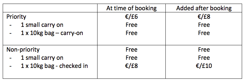 - людям, которые не приобрели и не хотят платить за опцию приоритетным посадки, однако, хотят провезти дополнительный багаж придется доплатить 8 € за сумку весом до 10 килограмм, которую придется сдать в багажный отсек самолета.