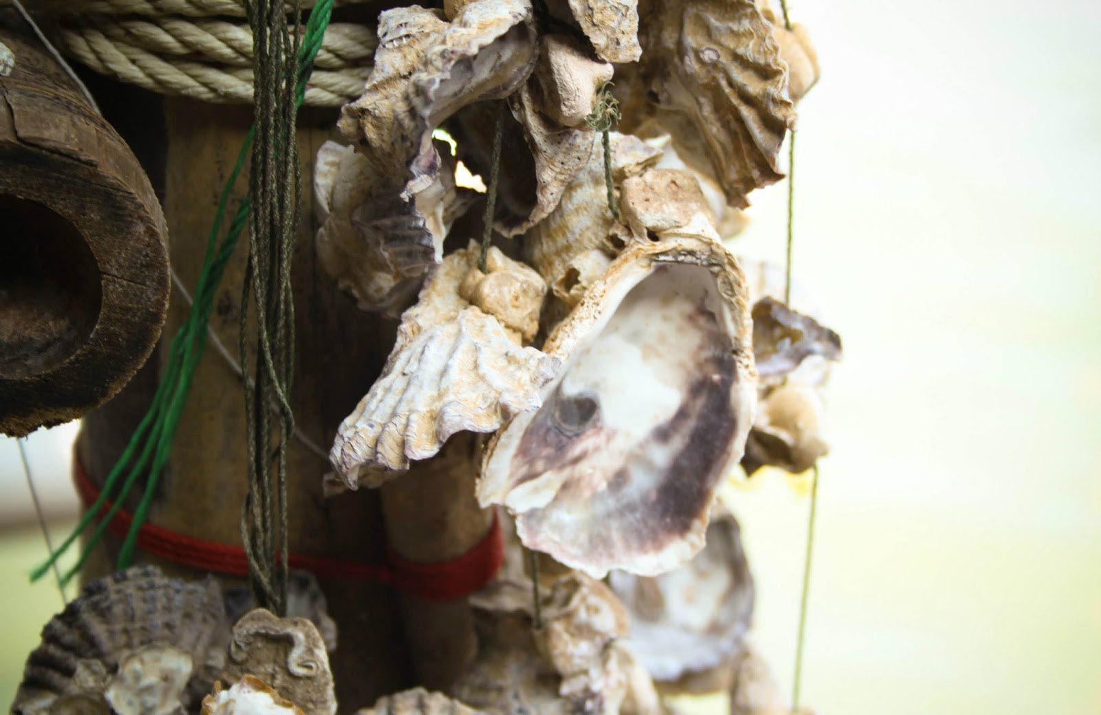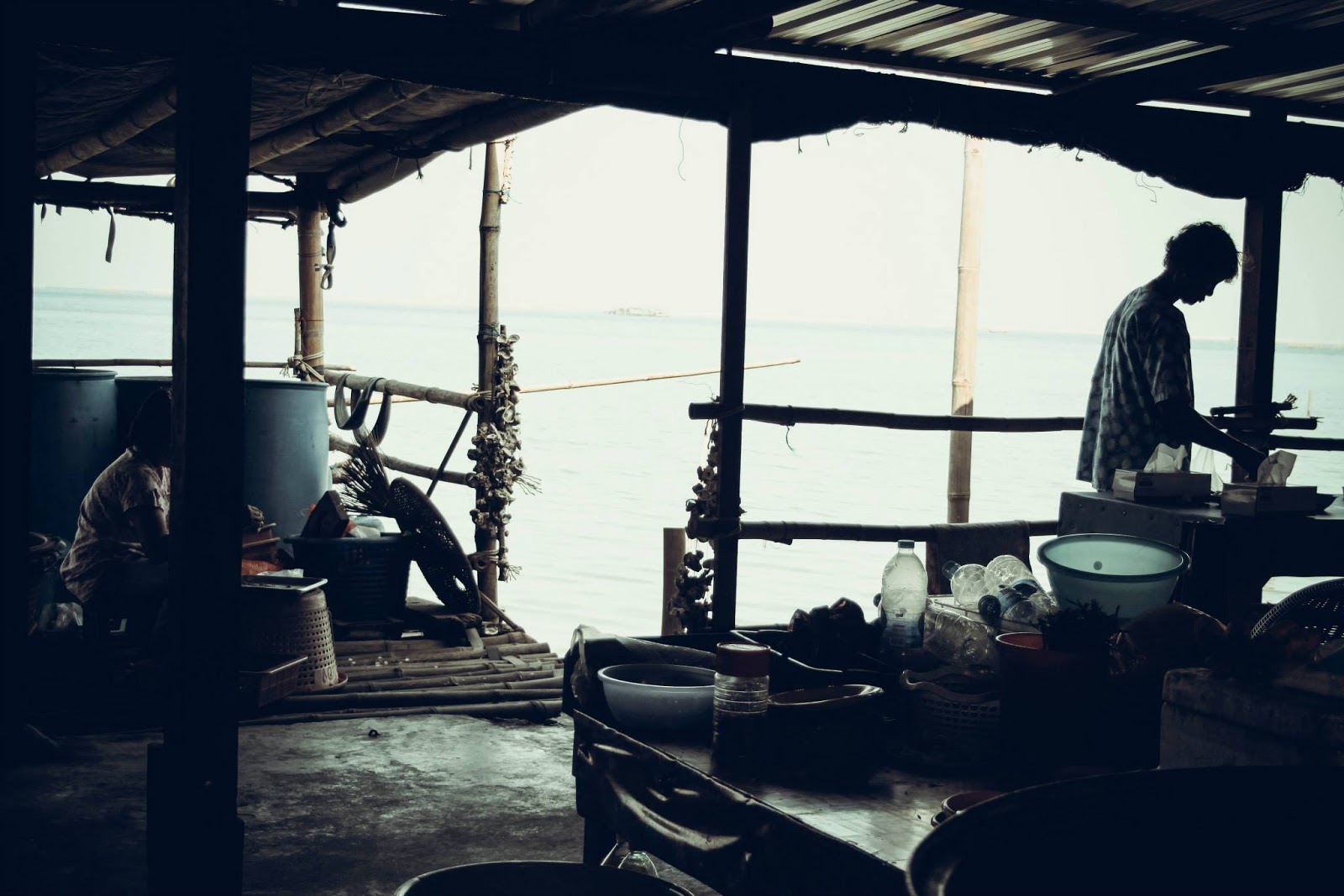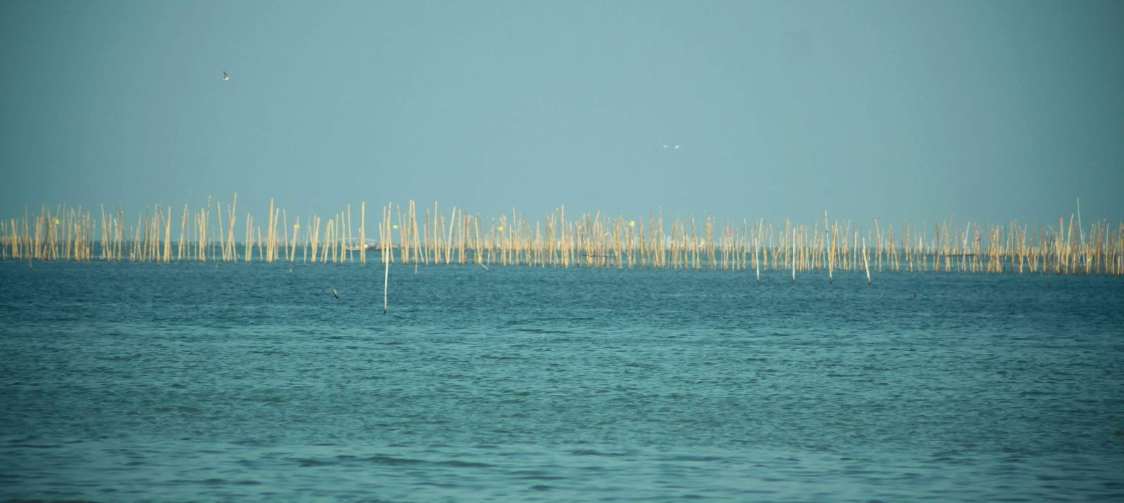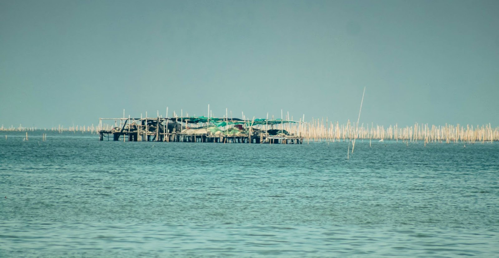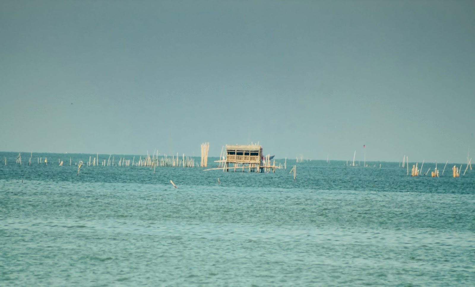 Она состоит из нескольких хижин, расположенных на берегу океана, около которых установлены специальные приспособления для ловли устриц.