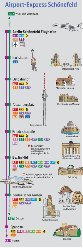 Поезд RE7: Dessau Hbf, Bad Belzig, Michendorf, Potsdam Babelsberg, Berlin Wannsee, Berlin Zoologischer Garten, главный вокзал Берлина (Berlin Hauptbahnhof), Berlin Friedrichstraße, Berlin Alexanderplatz, Berlin Ostbahnhof, Berlin Karlshorst, Flughafen Schönefeld, Blankenfelde, Zossen, Wünsdorf Waldstadt. Время в пути 32 минуты, поезд ходит каждый час.