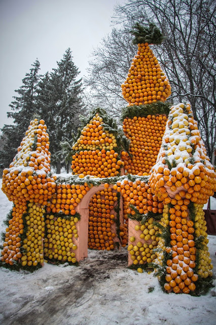 Всего для выставки использовали более 120 тонн фруктов, каждый из которых вложен вместо кирпича при строительстве замков.