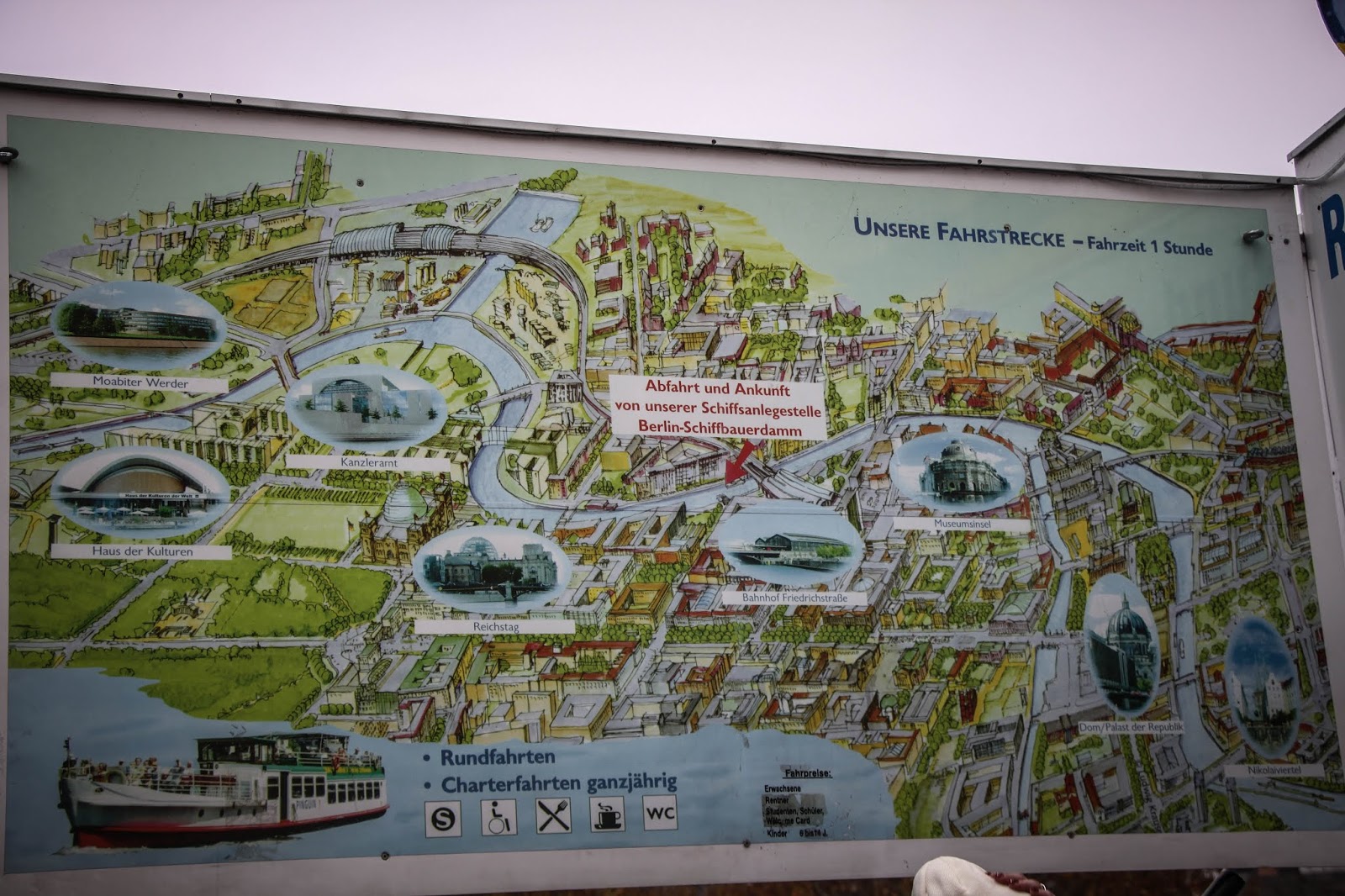 Мы воспользовались услугами — Berlin city tour — river cruise Spree Havelschiffahrt Начало путешествия : Berlin Schiffbauerdamm Schiffbauerdamm 12, 10117 Berlin Отправление каждый час, но лучше проверяйте расписание на сайте. Прогулка длится час.
