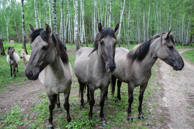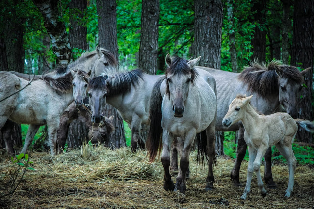 Конечно, не все они выходят к людям, ведь это не зоопарк, а реально воспроизведенная природная среда. Нам удалось увидеть стадо тарпанов, или польских коников, да еще и с потомством. «Коник» с польского переводится как «маленький» – действительно, лошади этой породы небольшие и невысокие. Живут тарпаны стадами, могут менять окрас в зависимости от времени года.