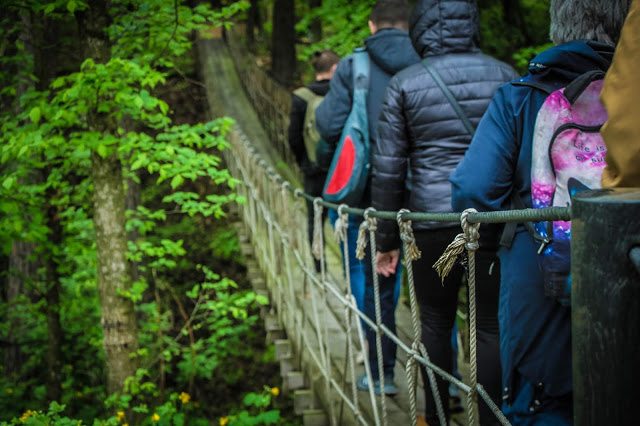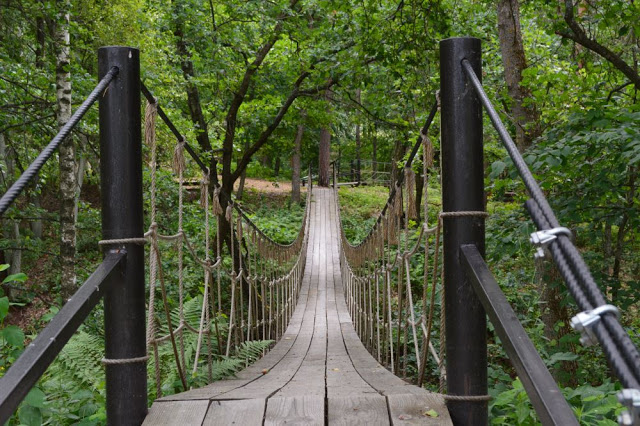 Далее тропа ведет в лес, где встречаются глубокие овраги, через которые переброшены красивые подвесные мостики, переход через которые поднимет настроение и уровень адреналина как взрослым, так и детишкам.