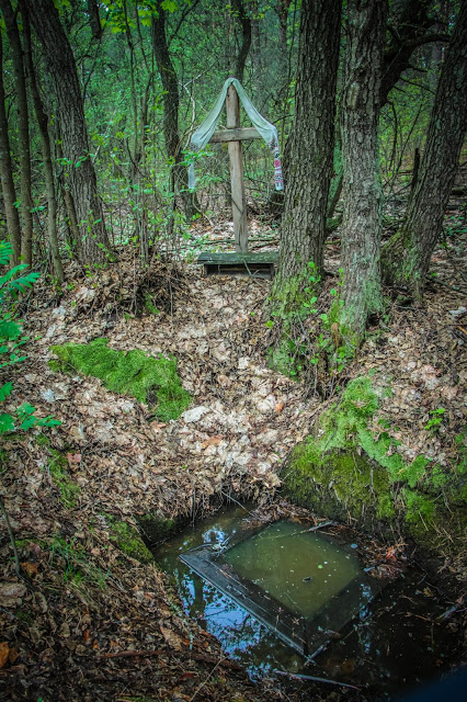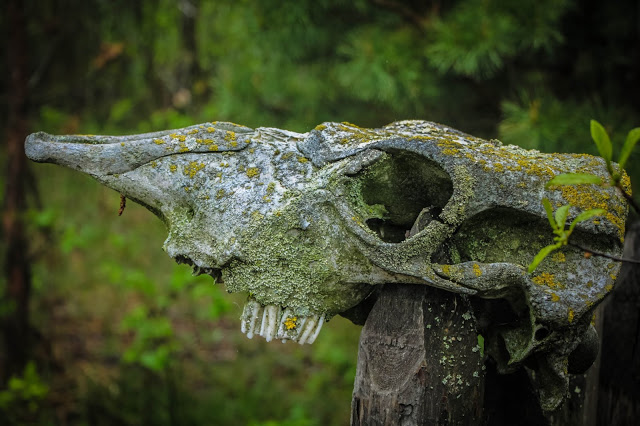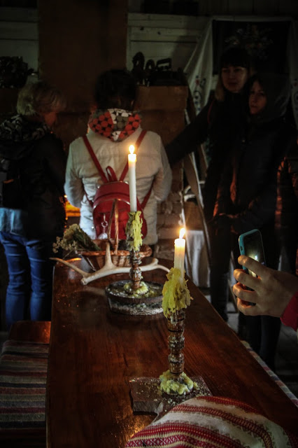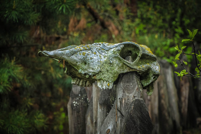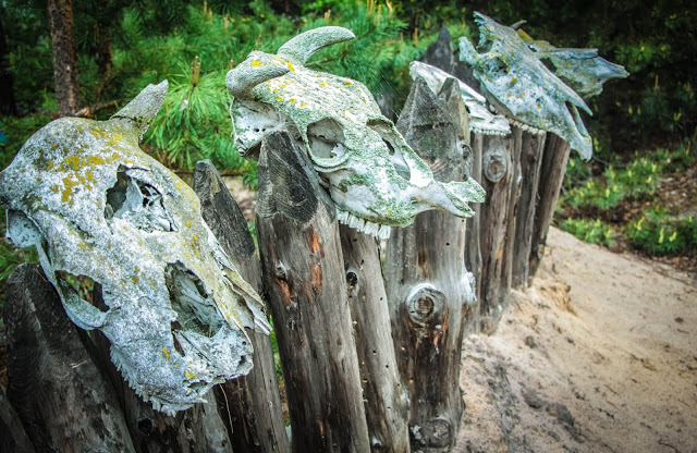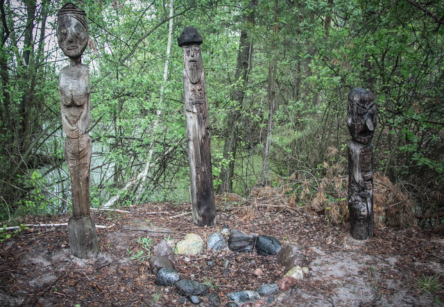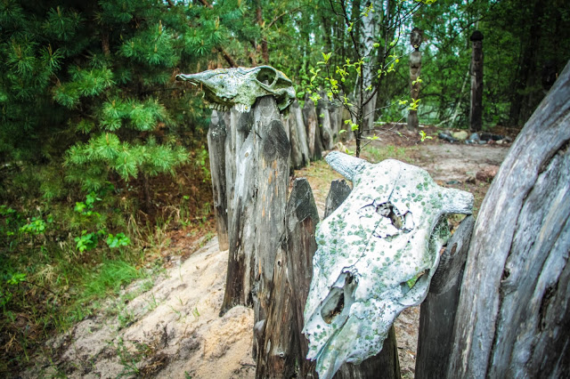 Завершается маршрут у языческого капища с деревянными идолами и черепами.