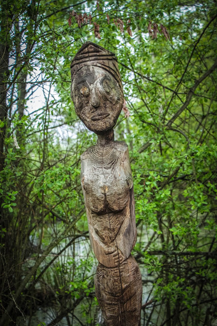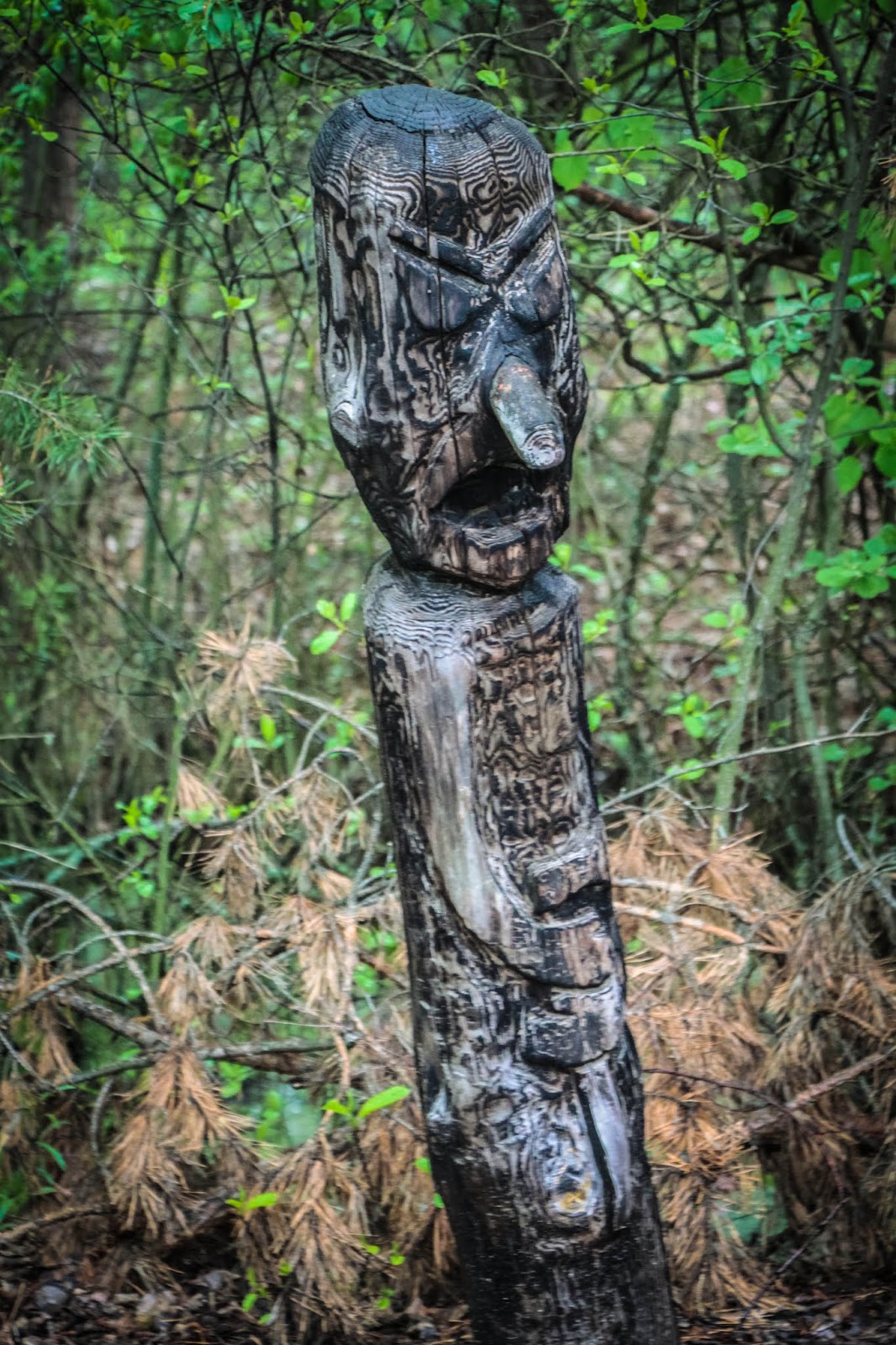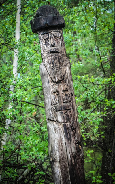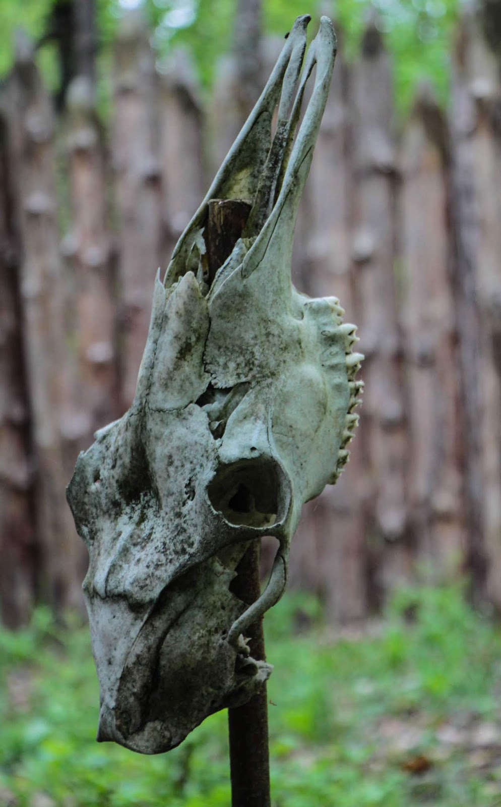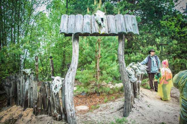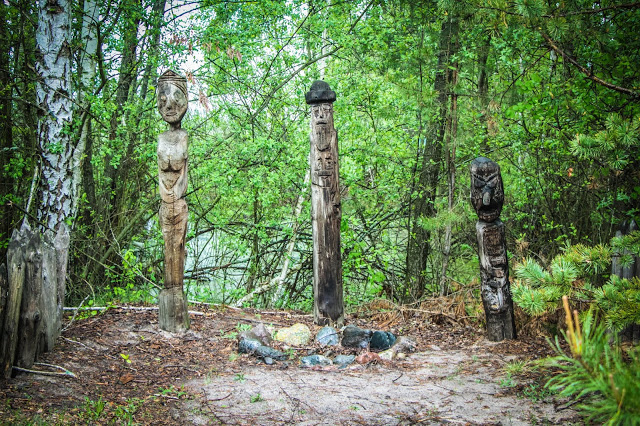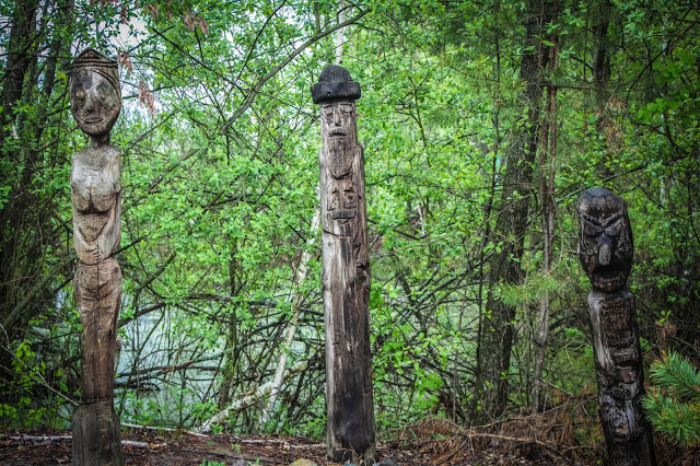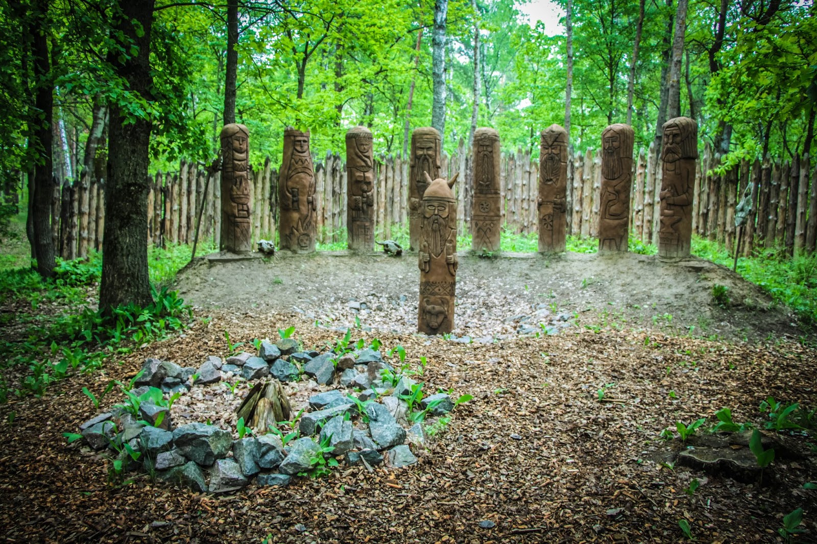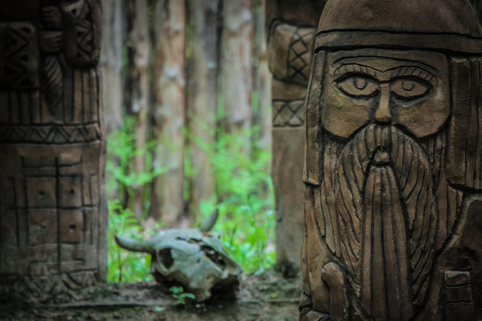 Завершается маршрут у языческого капища с деревянными идолами и черепами.