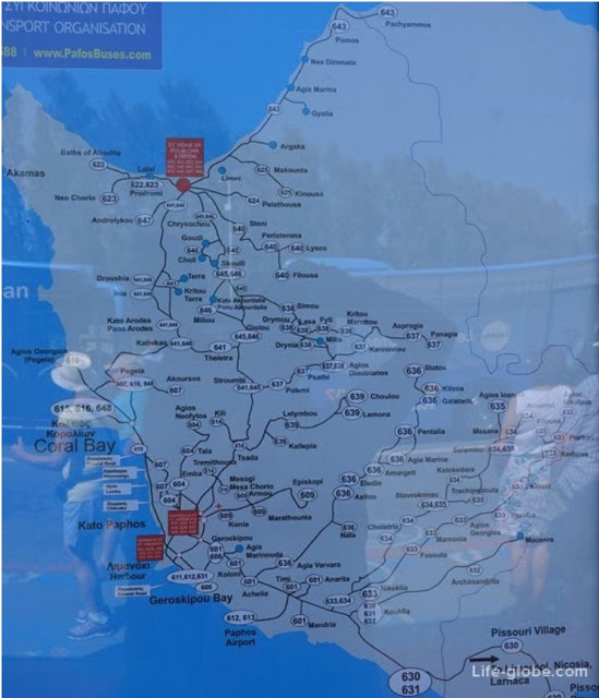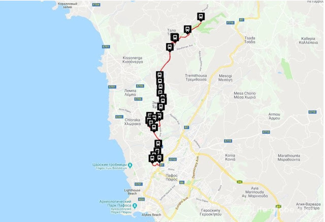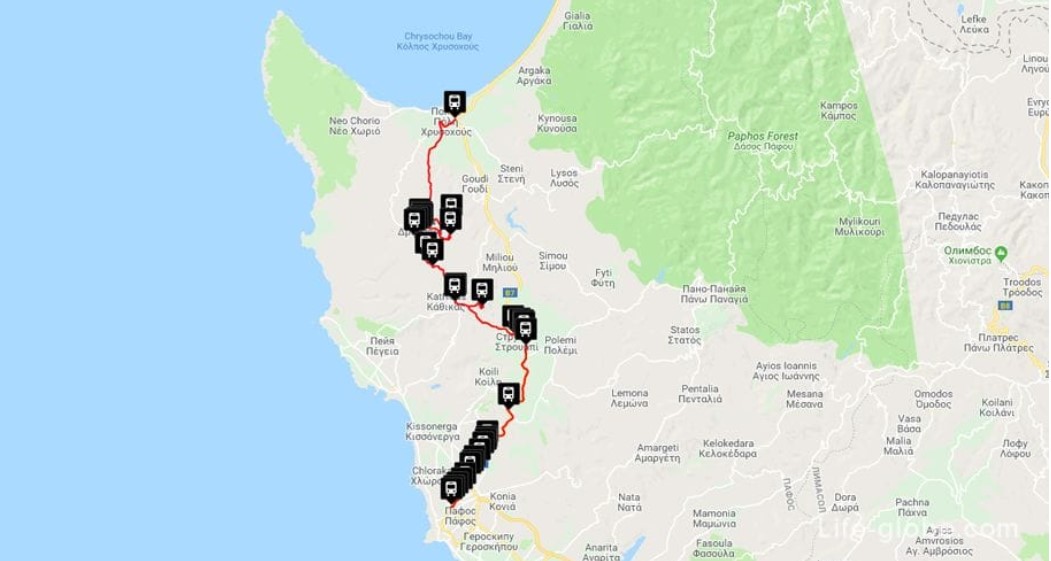 Маршрут движения автобуса 641: Polis Chrysochous — Terra — Kritou Terra — Ineia — Drouseia — Kato & Pano Arodes — Kathikas — Theletra — Paphos.