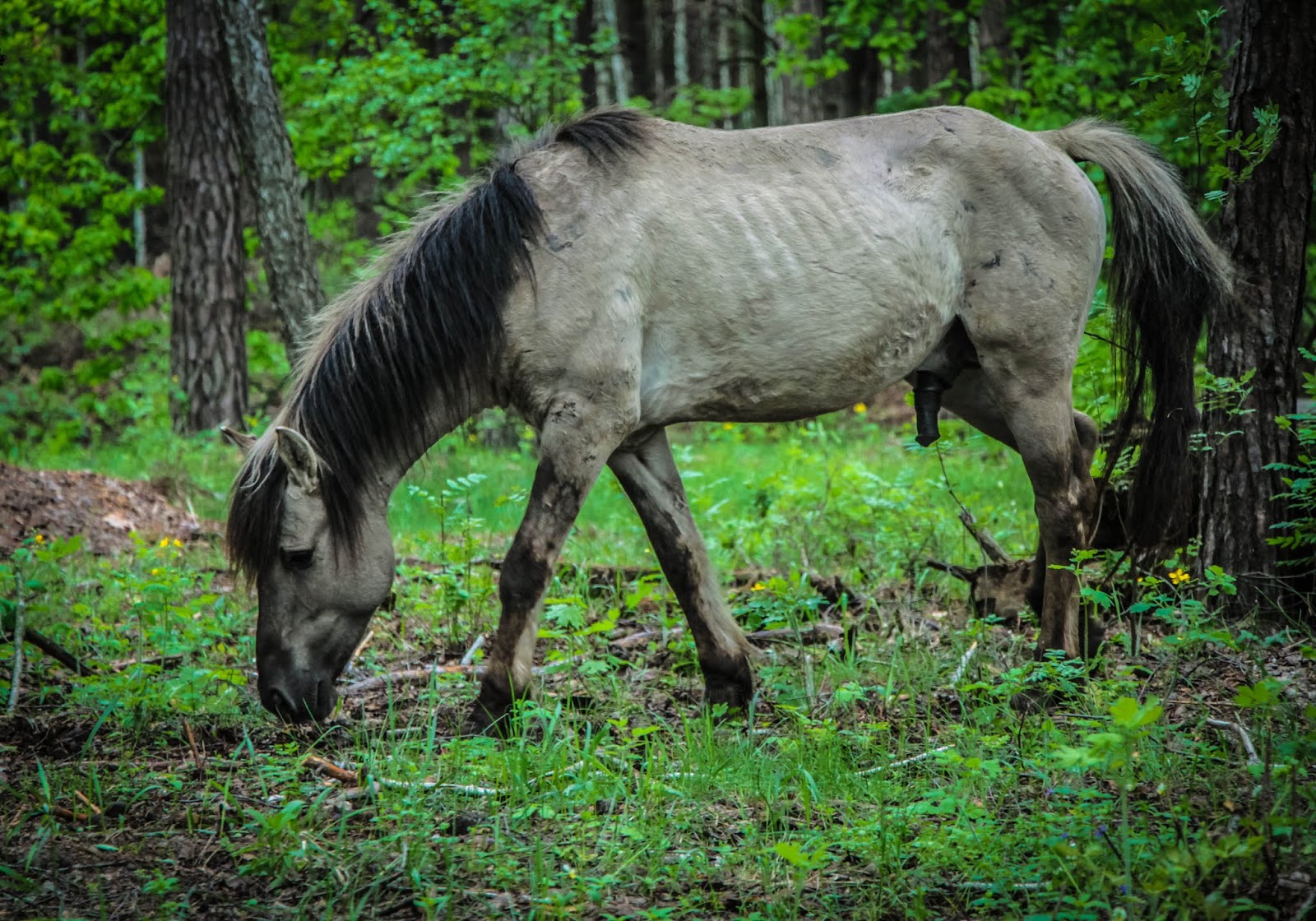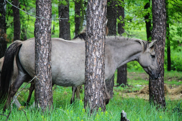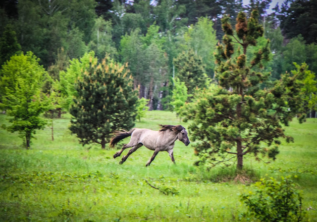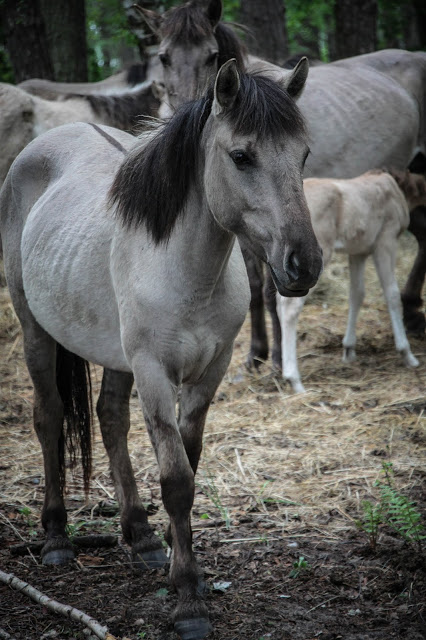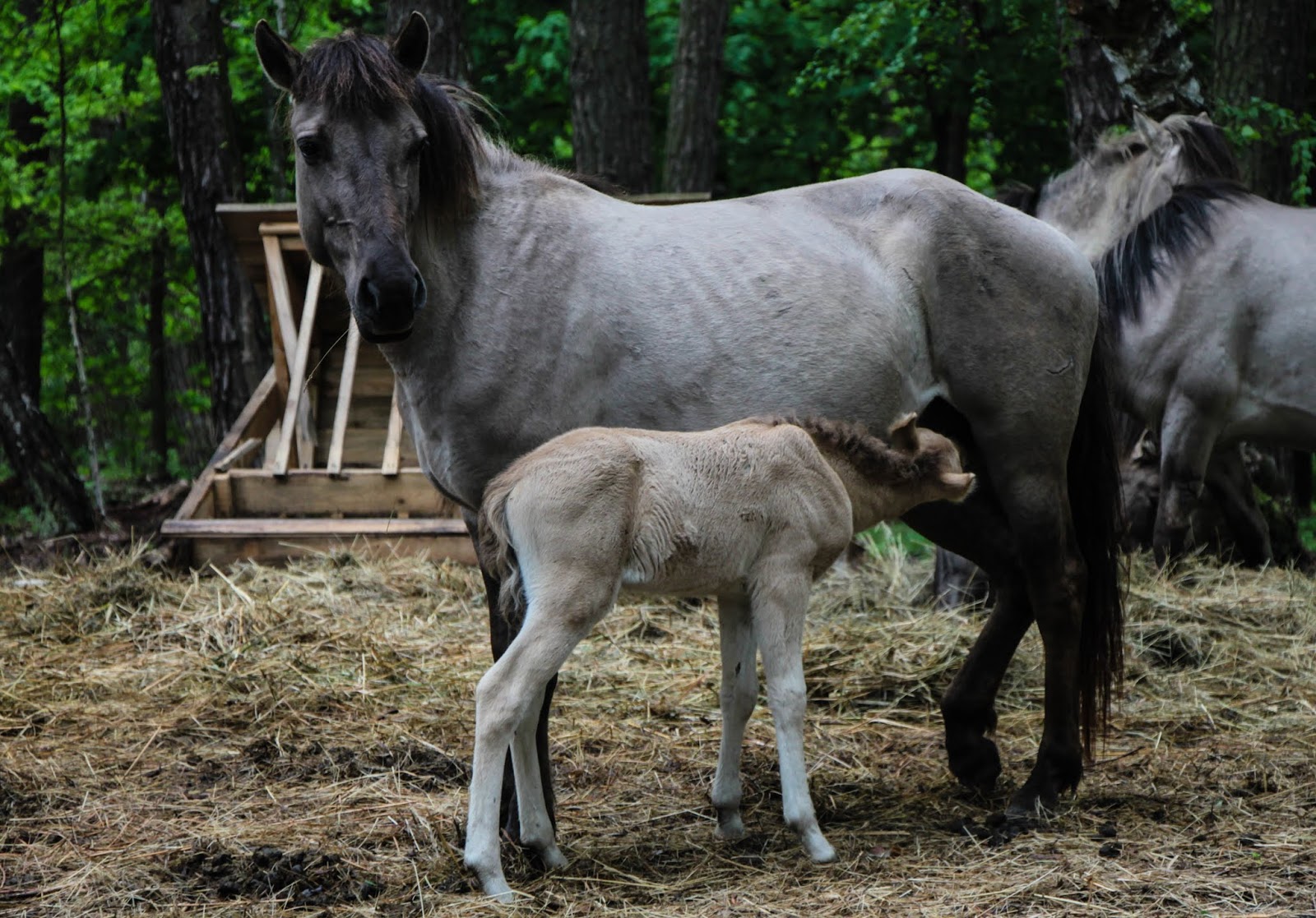 Конечно, не все они выходят к людям, ведь это не зоопарк, а реально воспроизведенная природная среда. Нам удалось увидеть стадо тарпанов, или польских коников, да еще и с потомством. «Коник» с польского переводится как «маленький» – действительно, лошади этой породы небольшие и невысокие. Живут тарпаны стадами, могут менять окрас в зависимости от времени года.
