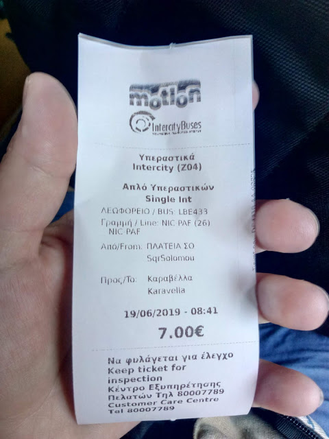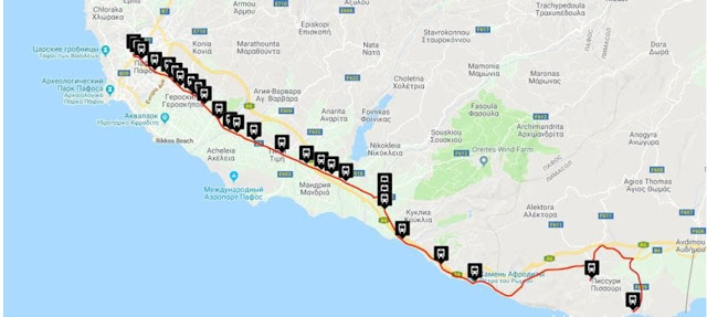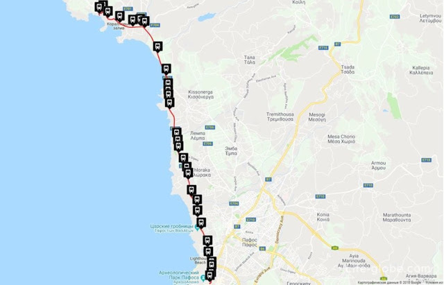Данный маршрут связывает автовокзал Каравелла с курортом Писсури. Проезжает камень Афродиты и пляж Афродиты.