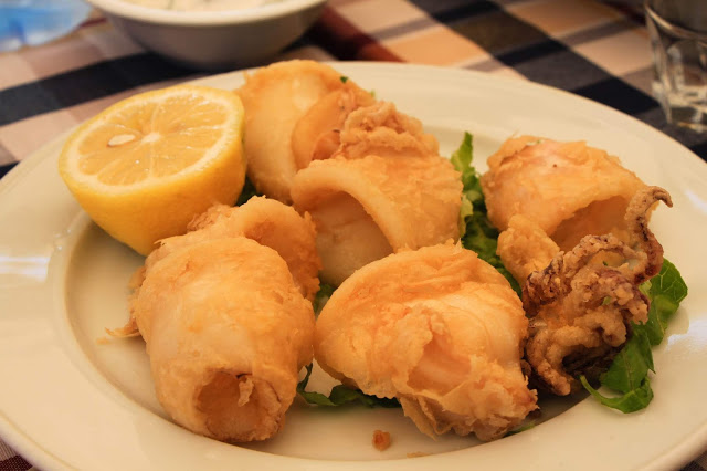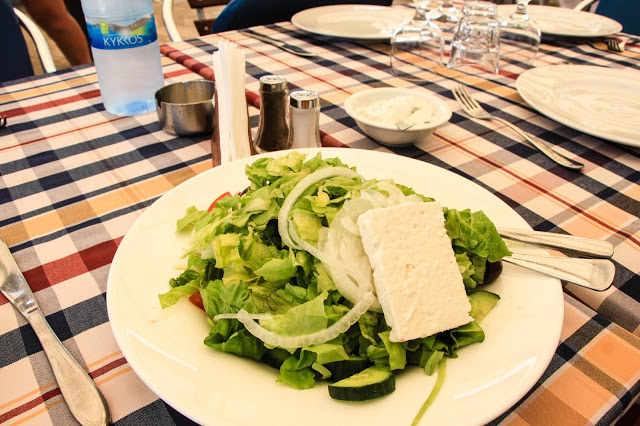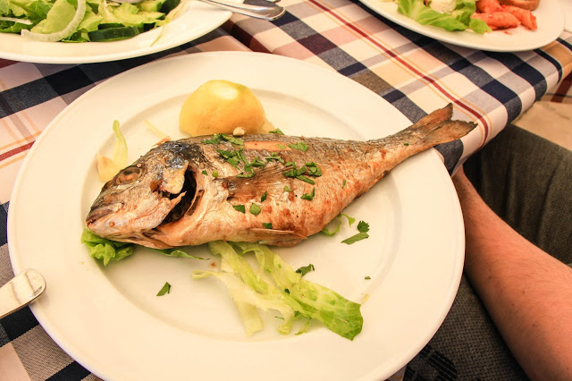 Ну и кужа ж без обеда. Угощали нас кальмарами в панировке, рыбой Дорадо, кашей кус-кус, картофелем, салат с сыром Халуми. Кипрским вином и фрешем из апельсин. Все это удовольствие на 1 человека стоит 16€.
