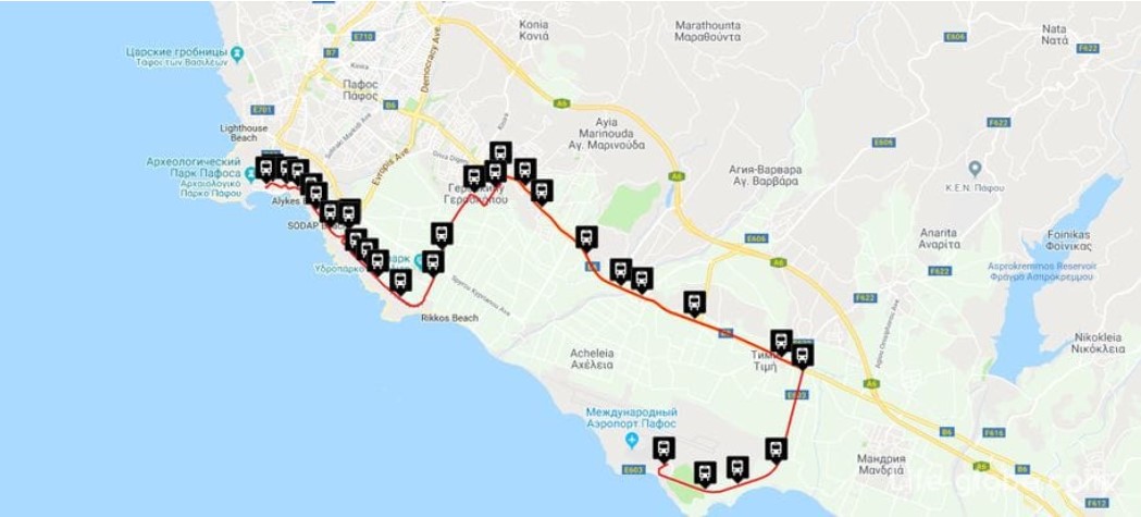 Маршрут движения автобуса 630: Karavella Station, Neofytou Nikolaides (Government Offices), Geroskipou, Koloni, Acheleia, Timi (Limassol — Paphos old Road), Kouklia (Archaeological Site), Petra tou Romiou, Pissouri Village, Pissouri Bay.