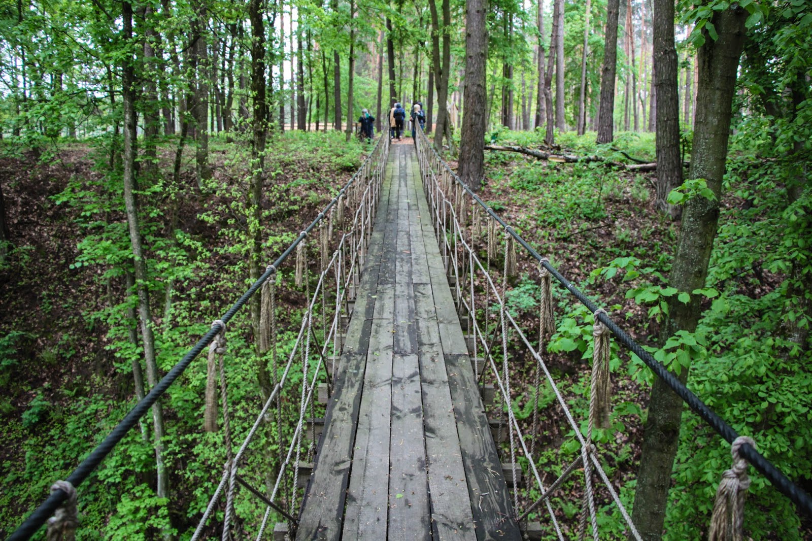 Далее тропа ведет в лес, где встречаются глубокие овраги, через которые переброшены красивые подвесные мостики, переход через которые поднимет настроение и уровень адреналина как взрослым, так и детишкам.