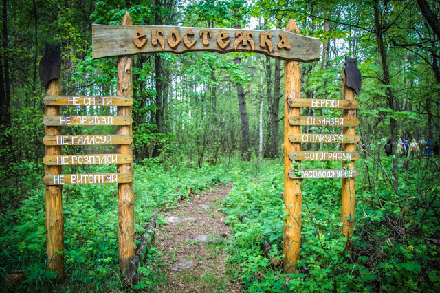 Экотропа «Журавлинная» — ее название происходит от птицы, а не от ягод. Знайте, что это ошибка, если вдруг встретите в сети русскоязычные тексты, где тропу называют «Клюквенной». Этот маршрут очень популярен, проходит среди типичного для Полесья сосново-березового леса и подходит как для взрослых, так и детей. Стенды на пути ознакомят вас со следами животных и научат разбираться в разновидностях деревьев и кустарников, а также структуре леса.