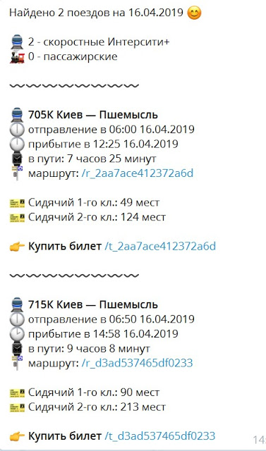 RailwayBot в мессендежере Telegram умеет искать поезда и создавать мониторинги билетов по заданным параметрам — направление, дата, приблизительное время, тип вагона. Пользуясь простыми подсказками легко создать отслеживание билетов на нужный вам поезд и как только появятся билеты — вы получите уведомление прямо в Telegram. Не выходя из мессенджера можно приобрести жд билеты (через систему Приватбанка)